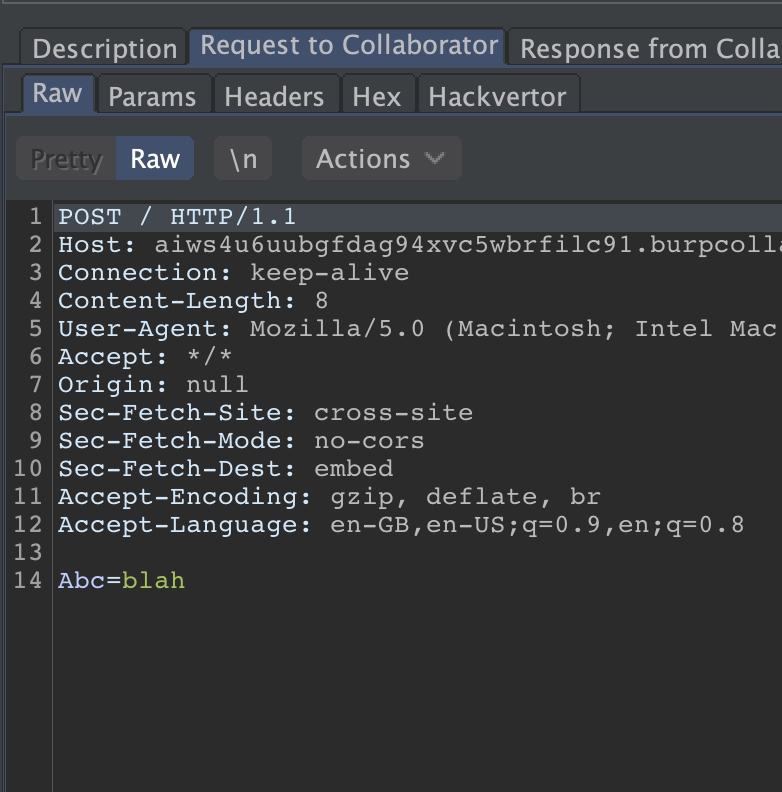 You can even send raw new lines, which could be useful when chaining other attacks such as request smuggling. The result of the POST request can be seen in the following Collaborator request: